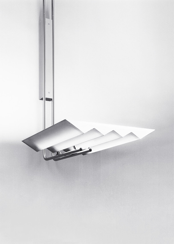Die beiden Vorschaltgeräte mit Druckschalter sind sichtbar am Gestänge eingehängt. Design und Technik ergänzen sich. Die Leuchte wird Vorreiter in der Bürobeleuchtung. Sie wird in das Leuchtenprogramm aufgenommen. Es folgen immer grössere Aufträge, die zum Firmenwachstum führen.