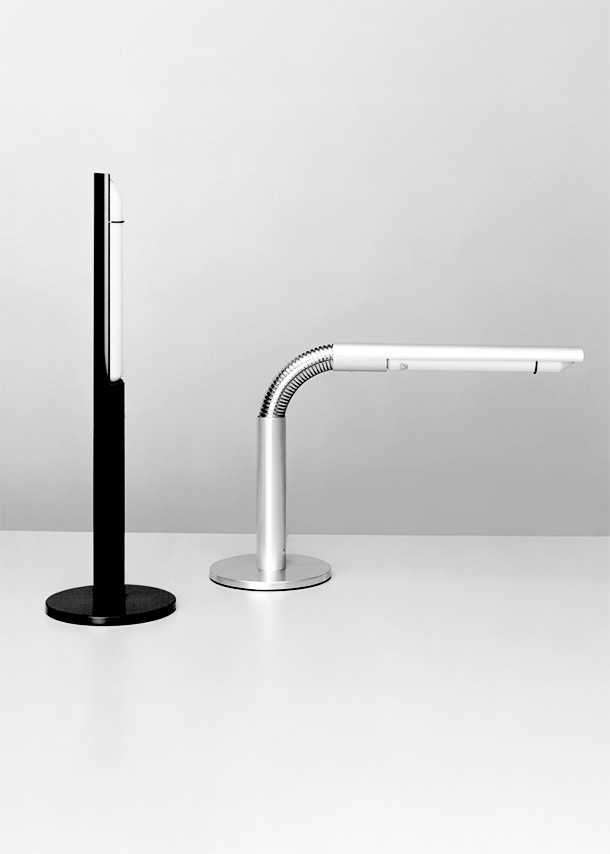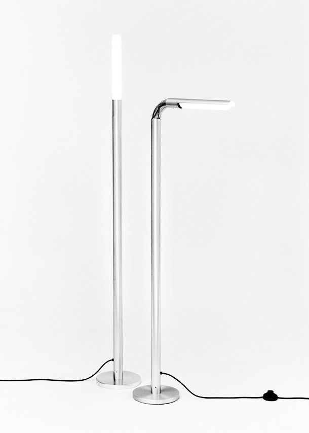 Die Stehleuchte HS und die Tischleuchte S1 bilden eine Leuchtenfamilie mit Soffitenglühlampen. Der drehbare Rohrreflektor als Blendschutz und das Stehrohr sind aus demselben Alurohr, das bei vielen Tisch- und Stehleuchten eingesetzt wird. Eine neue Komponente ist der passgenaue Metallschlauch, der Stehrohr und Rohrreflektor verbindet