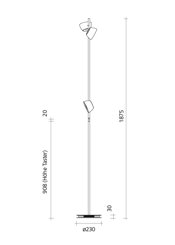 Die aufsetzbare Optik bietet die Möglichkeit, den Abstrahlwinkel zusätzlich zu bündeln, was sich für Leselichtanwendungen sehr gut eignet. Mit den zwei Tastern am Gestänge ist eine einfache Bedienung vom Sofa aus möglich. Es kann das Indirektlicht mit zwei Köpfen oder das Direkt- / Leselicht mit einem Kopf separat geschaltet oder gedimmt werden.
