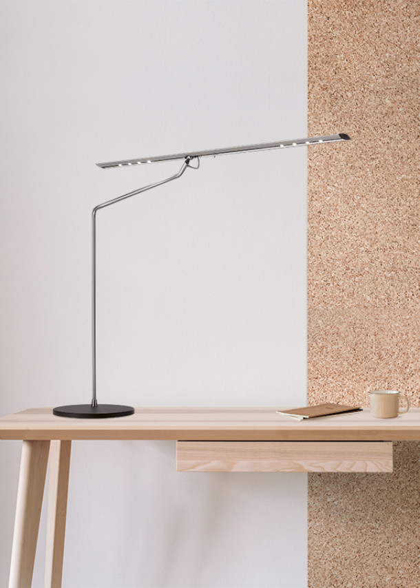 Das Merkmal von LET ist das filigrane Profil des Leuchtenkopfs mit Kugelgelenk. Das Licht entsteht durch die typischen Lichtmodule mit vier Power-LEDs. Die Leuchtenfamilie besteht aus Tisch-, Steh- und Hängeleuchten.