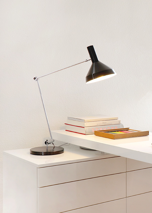 Die Zeichentischleuchte TYPE 60 mit ihrer grossen Ausladung und vielseitigen Beweglichkeit ist eine Weiterentwicklung der TYPE 600. Der konische Reflektor ist kleiner, tiefer und bekommt einen stabilisierenden Knick. Er wird ausserdem zweiteilig, der Gegenreflektor entfällt. Das Fassungsrohr aus Aluminium mit eingelassenem Druckschalter wird später für die zweite Serie der TYPE 600 übernommen. Dank der sechs Gelenke ist TYPE 60 eine praktische, gut verstellbare Tischleuchte. Wegen der vielen Teile ist die Herstellung jedoch aufwendig. Daher entstehen bald viele ähnliche Modelle (z. B. COMBILUX,